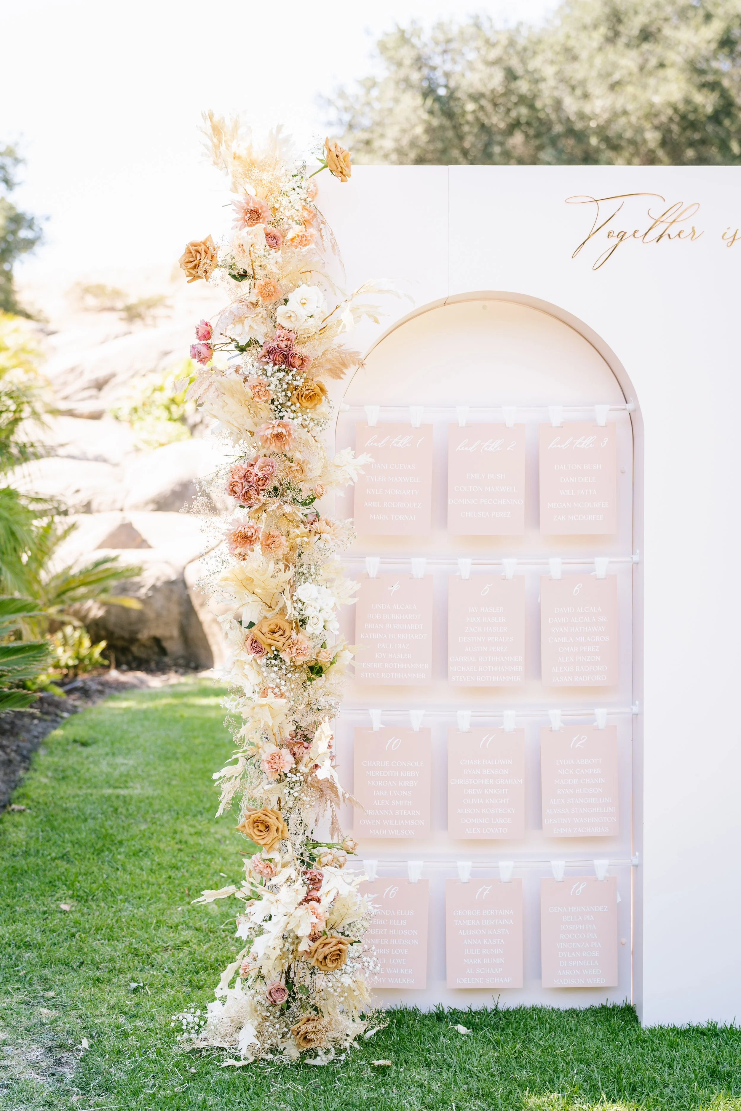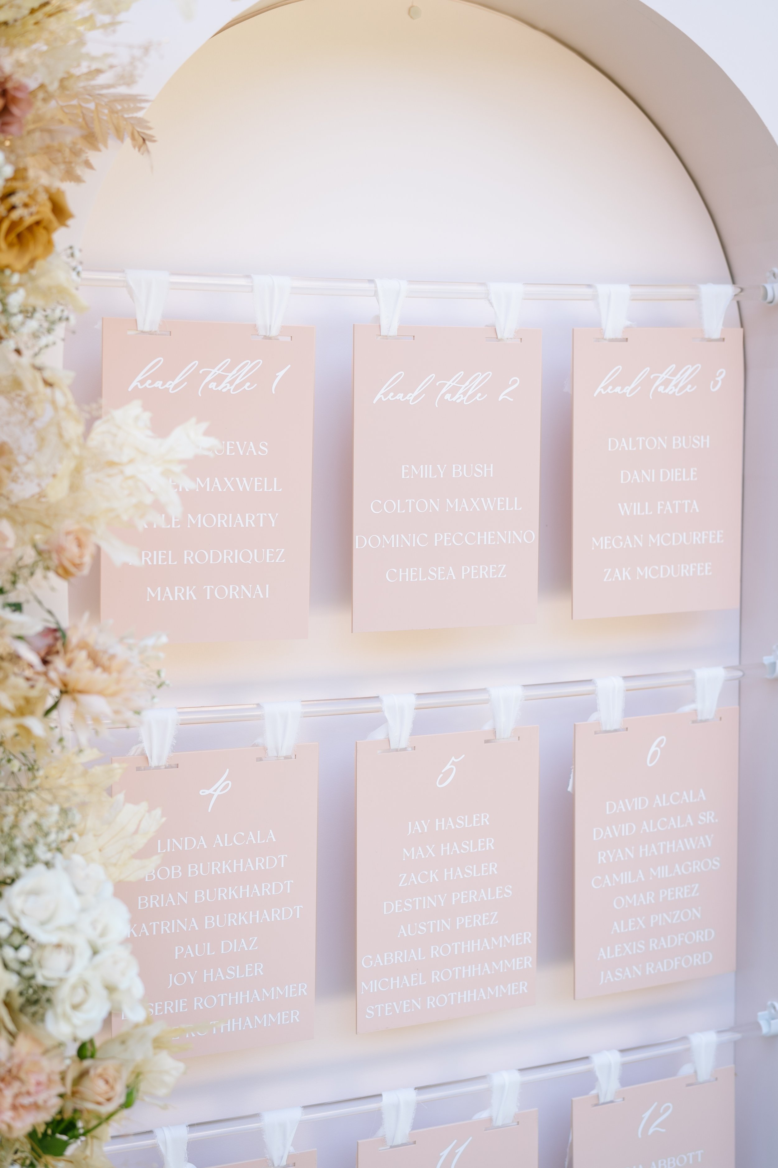 this couple wanted tons of signage for their wedding at villa loriana, and we were so happy to make it all for them! from a beautiful escort display to custom drink stirrers with their last name, no detail was left untouched.
